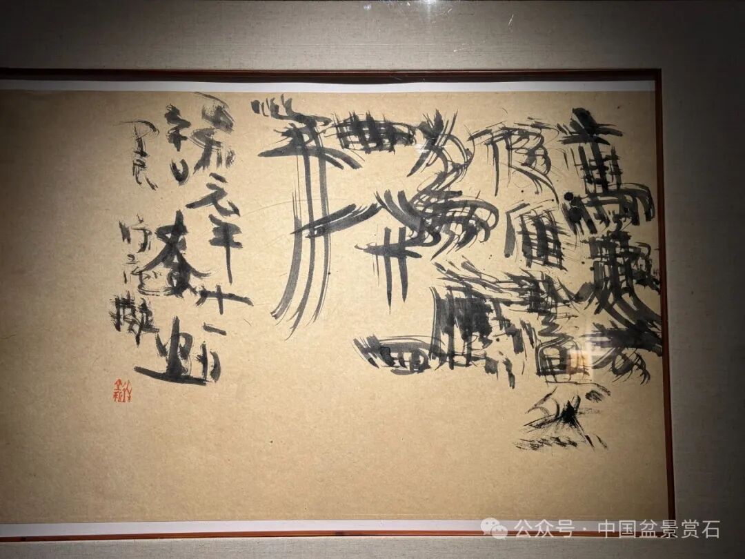 本次展览风格新颖,试验意味尤浓。盆景立足榆树,赋予诸草,取材信手拈来,皆成妙章。书写立足经典,赋予诸本,不择笔墨纸砚,大朴不雕。加之明清石座几案为基,气息内敛中古框装,以及汉唐宋元文玩点缀其间,令展览处处透露出古雅风致与不凡品味。盆景与书写的表达形式在此处开启了崭新可能。▲ “高超方便”镜片 46ⅹ77cm,“拂尘” 榆树 高60cm,净庐ⅹ些园日课