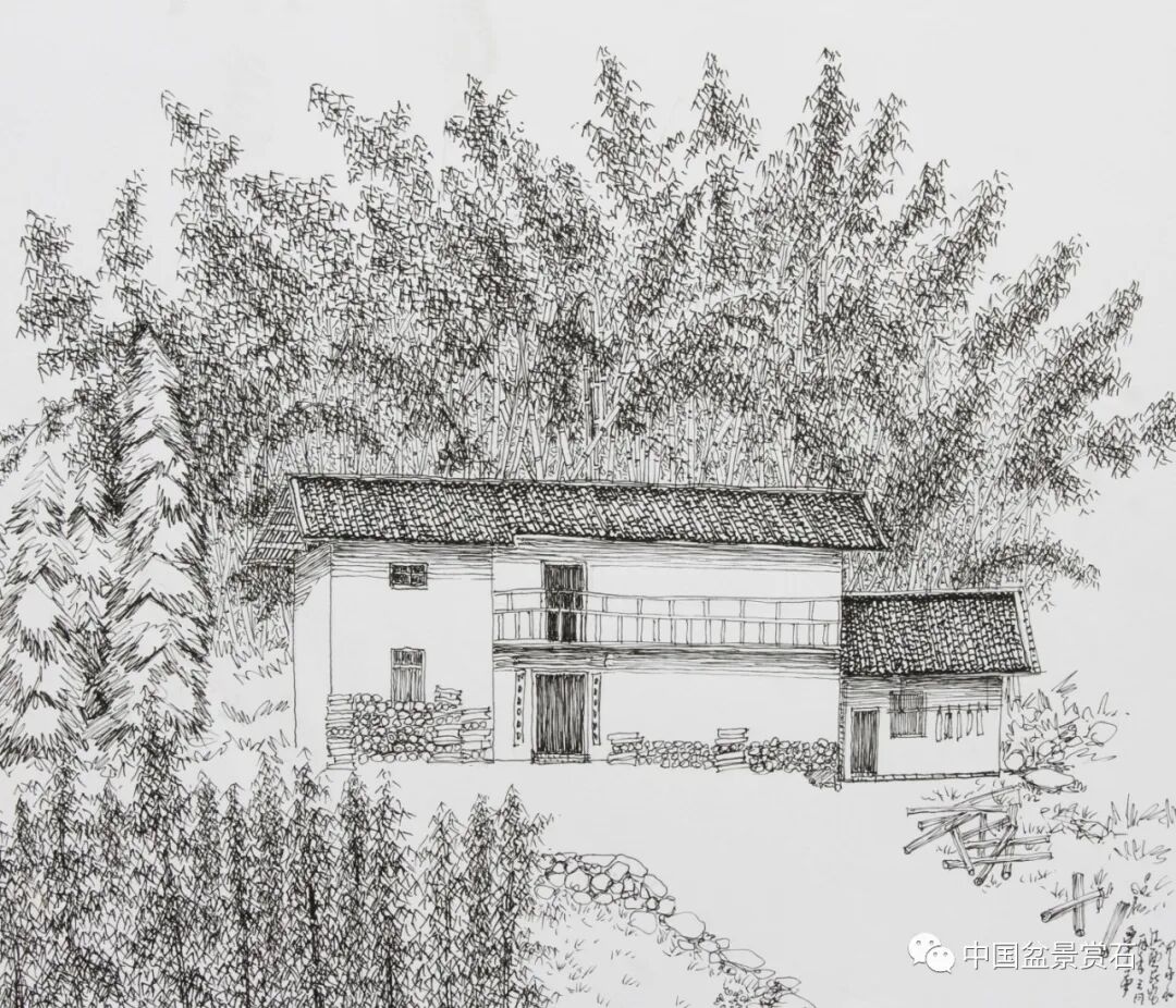 我的水乡与山村盆景梦,当然,我喜欢自然,但更喜欢水乡与山村的文化生活。所以,我突发奇思为了实现这个“梦”也整整探索、研究了一年多,目的是使盆景变得更加有故事,有内涵。线笔速写江西民宅