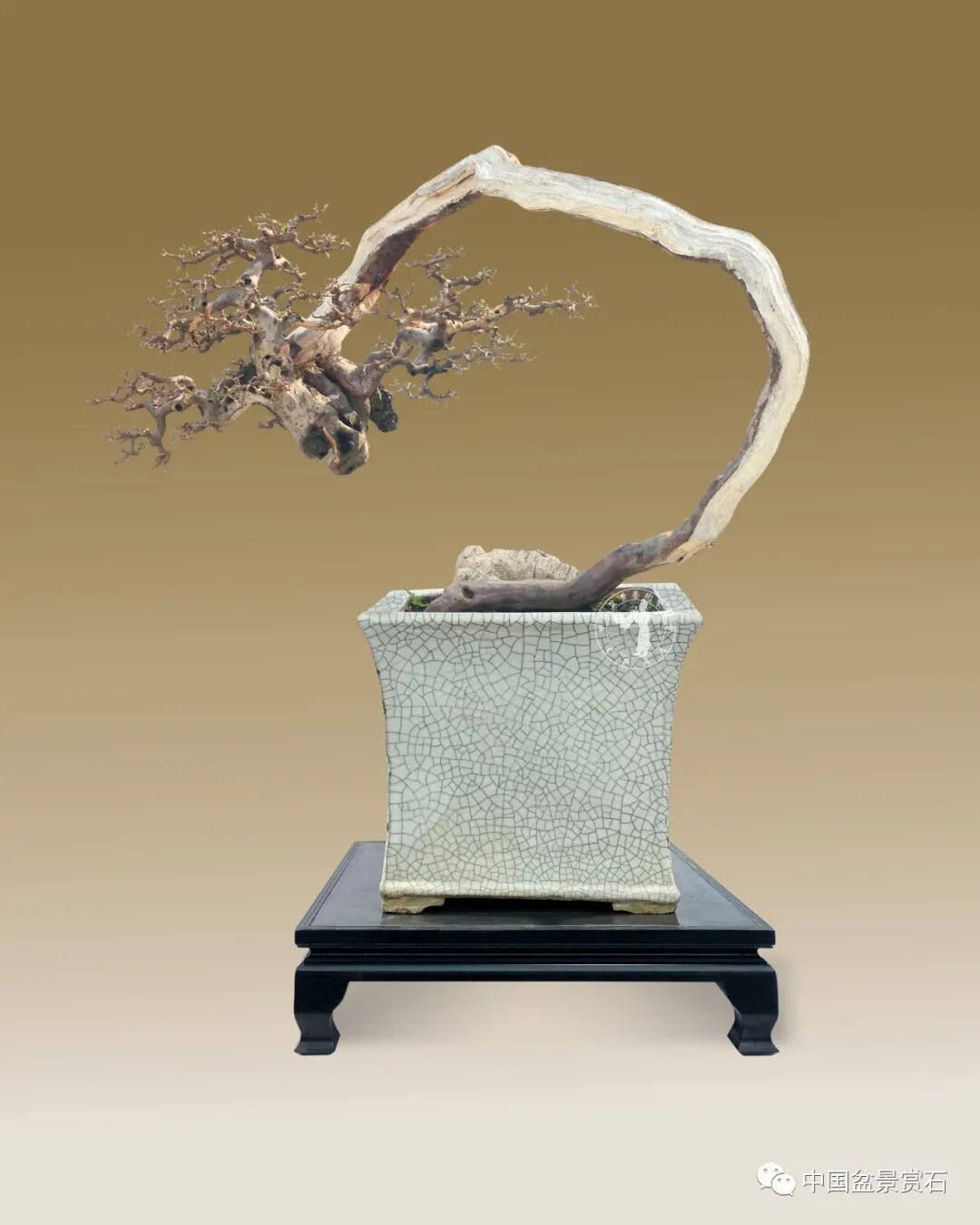 正是基于这诸多特殊性的存在,盆景艺术才得到了如此广泛的喜爱。作品从创作之始就进入了欣赏阶段,丰富多姿的桩形、有待造型的枝条及变化莫测的生长姿态,都增加了玩赏乐趣。尤其是随着时间的变化而生成的自然生态形象,晨昏各异,四季不同,这种效果是其他艺术品欣赏所得不到的。这种奇特的效果更增加了作者和观众在欣赏盆景作品时所获得的审美愉悦和额外的惊喜及乐趣。“追日” 高80cm 宽110cm 李新作品