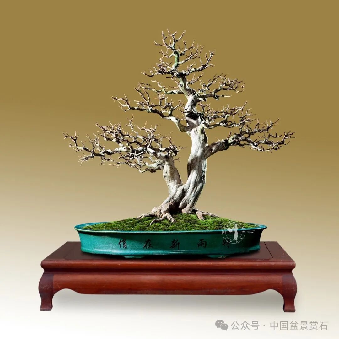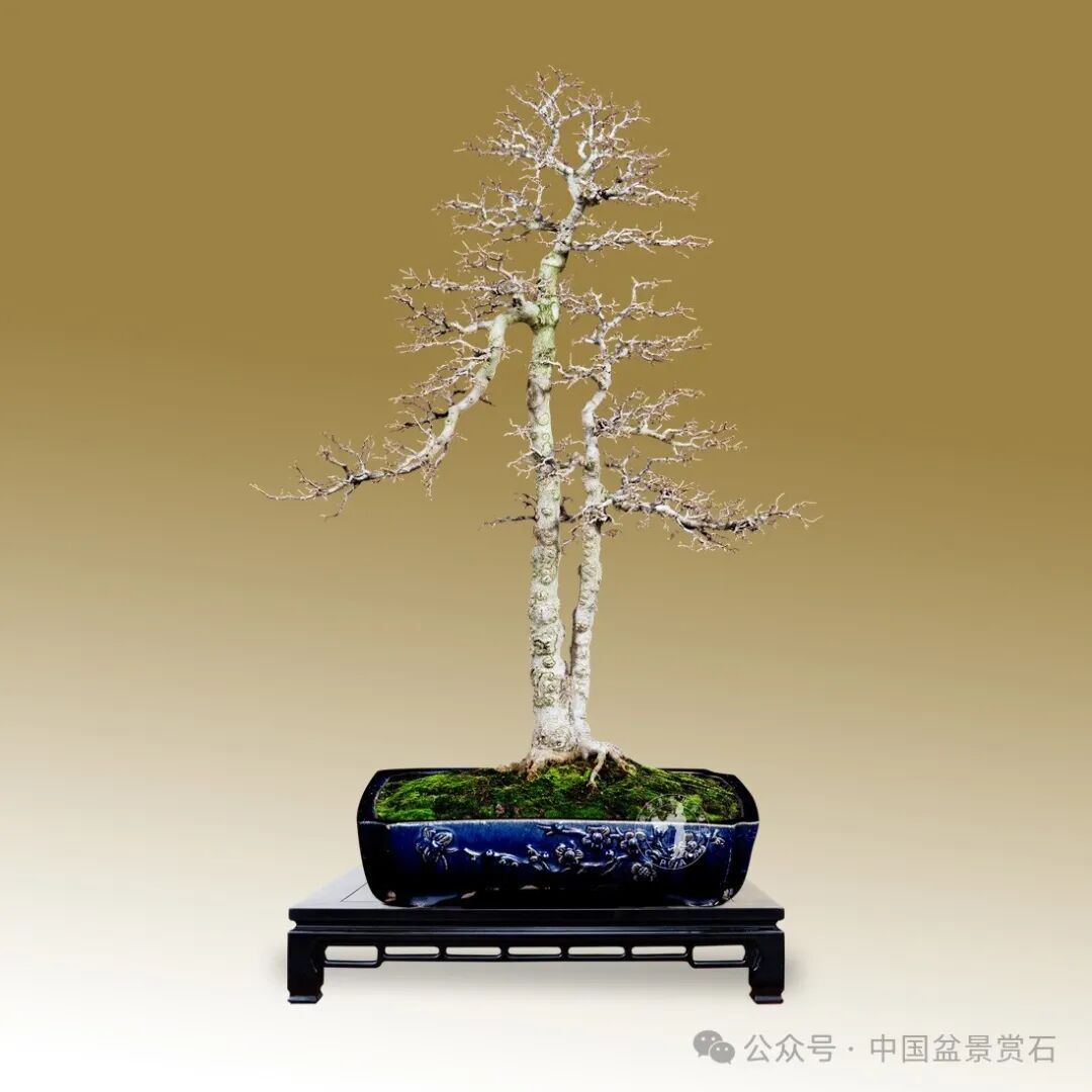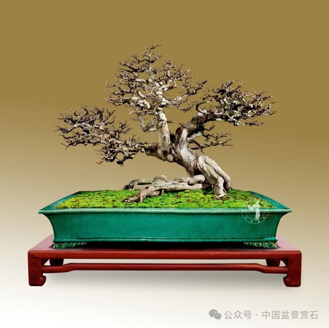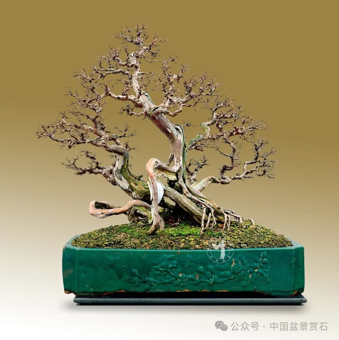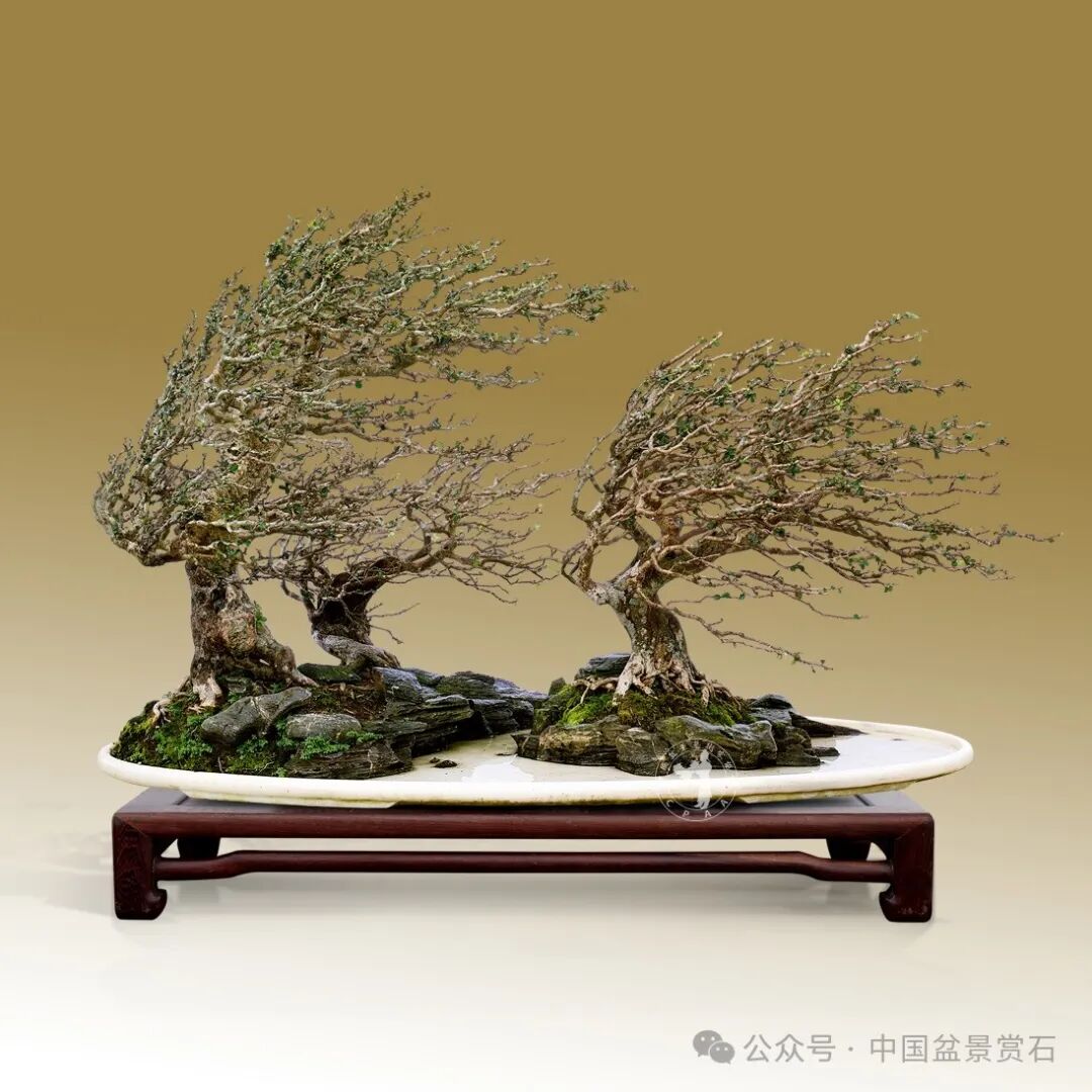 “绝代双骄”的主干挺拔伟岸,副干出土后“追随”主干,以“仰望”主树结顶,主副两干顾盼生情,这是作品的灵魂。主干的左跌枝和副干的右飘枝,一左一右,在构图上达到视觉的平衡,其它枝条随形而出,或追随,或顾盼,疏密得体,藏露相宜,散发出飘逸、自然的艺术气质。树干树瘤疙瘩密布,色泽灰白,如此老到的年功非短时间可造就,树虽小,苍劲、老辣、雄伟,达到小中见大的艺术效果。