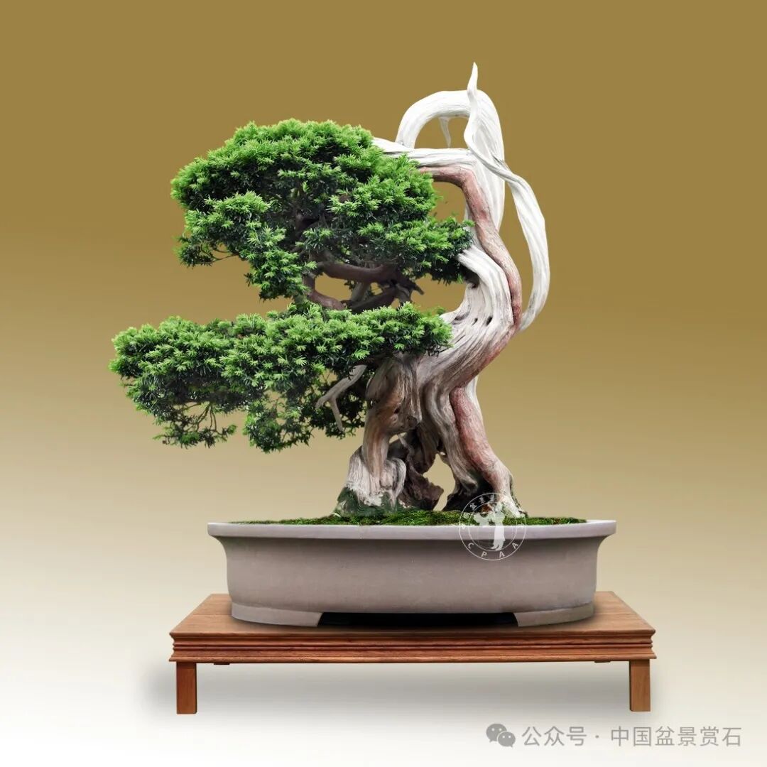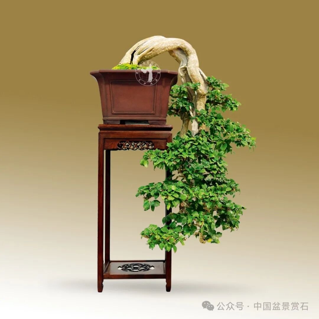 这是个令人过目不忘的作品,吸引力在于它简洁的构图,枯荣对比的舍利和郁郁葱葱的旺盛生命力。如果不是左边绿叶提醒,我们真认为这是个很美的根艺作品,水线、肌理、构图、色彩搭配非常完美。一条粗大的水线,把目光从右带到左,仅上下两个大枝托就完成了整个作品的构图,构思和创作手法别具一格。左边枝托的勃勃生机和右边雕塑般的舍利,形成枯与荣、生与死的强烈对比,生死亦平常,活着当自强。世间多少事,参透脱尘凡。更多精彩,请关注“中国盆景赏石”公众平台!“中国盆景赏石”为中国盆景艺术家协会唯一官方微信公众号!