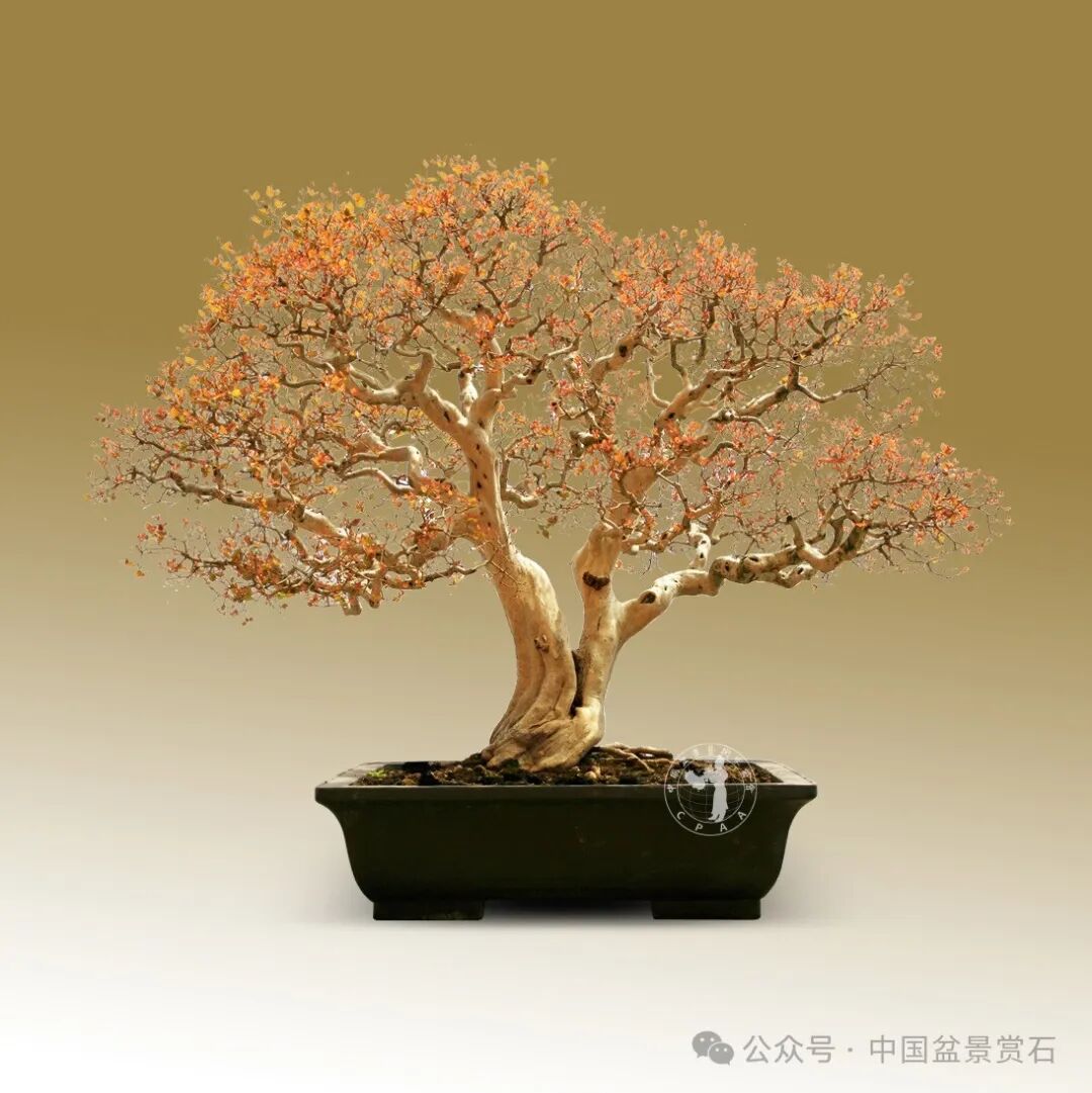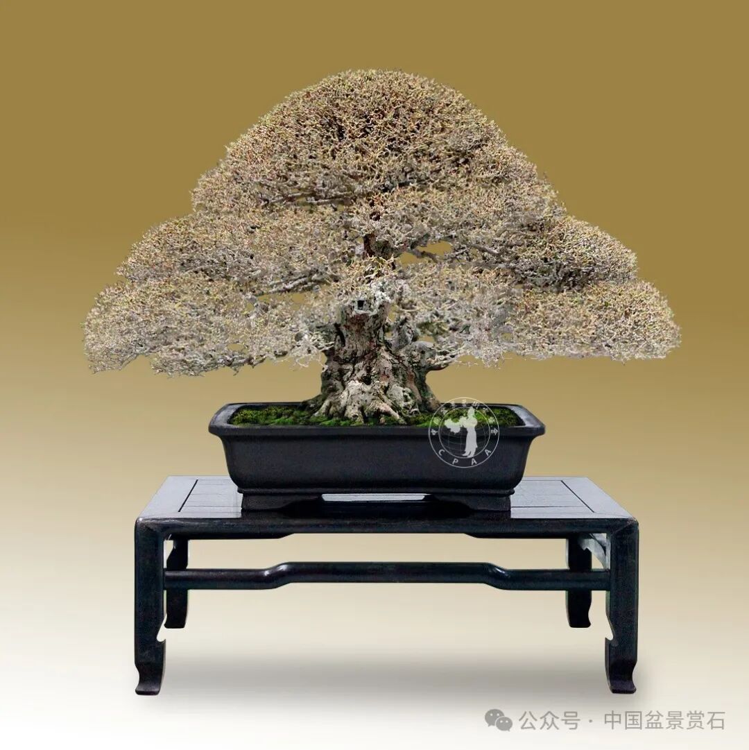 这是一盆盆龄长、枝爪老辣的作品。盆景人都知道,细小枝条的培育才真正体现盆景人的功底,首先要有优良的介质(泥土),其次有细至深厚的剪工,第三水肥虫害要有科学管理。这盆作品,采用等边三角形构图,树身苍劲,枝条工整细腻,数以万计的枝头,光摘叶疏芽就得花上几天时间,正是台上十分钟,台下十年功!盆景艺术的表现形式多种多样,一个作品,只要能自圆其说,对作者本人来说就是好作品。海纳百川,有容乃大;一枝独秀不是春,百花齐放春满园。中国盆景艺术要走出国门和国际接轨,不正需要海量的包容么!